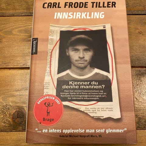 Carl Frode Tiller Innsirkling bok. Inneholder informasjon om forfatteren og hans verk. Passer for lesere som er interessert i norsk litteratur.