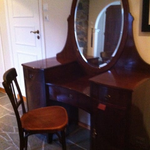 Vintage Sminkebord med tre speil og skuffer i lyst tre