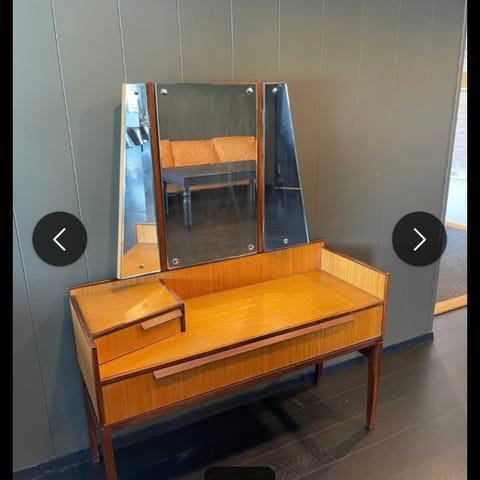 Pent og solid retro sminkebord / skrivebord i heltre, trolig fra 50–60-tallet. Klassisk design med koniske ben, to skuffer på hver side og originalt tredelt speil som kan slås inn/ut.