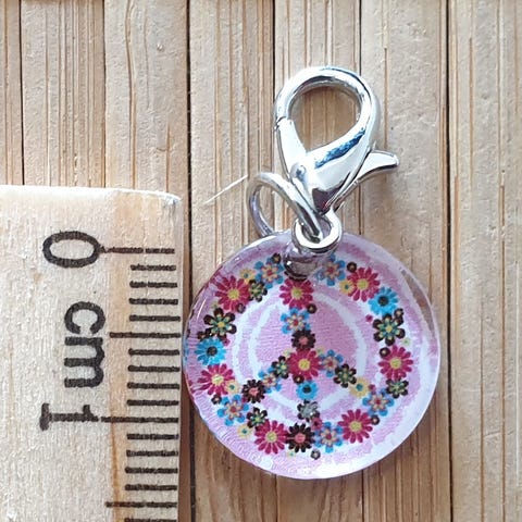 Et rundt, mørkt anheng med et nydelig grønt og hvitt motiv som minner om en blomst eller en krysantemum. Materiallet er metal.