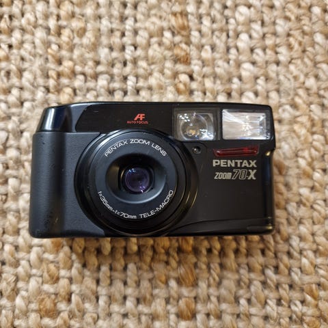 Selger et Pentax Zoom 105-R, et populært point-and-shoot analogt filmkamera fra 1990-tallet. Kameraet bruker vanlig 35mm film og er kjent for sin brukervennlighet og allsidige linse. Det er derfor et supert kamera for folk som prøve seg på filmfotografi eller oppgradere fra engangskameraer.