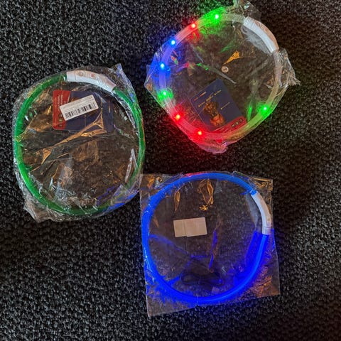 To stykk halsbånd til hund, ett i metall og ett i lær. Begge passer stor hund, er brukt på Golden doodle. Halsbåndet i lær er på 42 cm fra spenne til første hull, og 55 cm totalt. Pent brukt og i god stand, kjettingen er svært lite brukt.