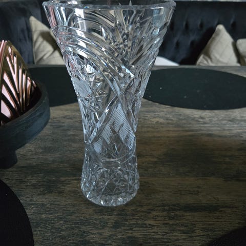 Tung, feilfri krystallvase fra Norsk Krystallindustri med blomstermotiv. Høyde ca 20 cm