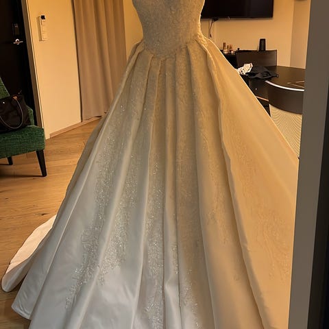 Atelier brudekjole i hvit farge, størrelse M. Kjolen har blonder og er designet for kvinner. Passer til bryllup eller formelle anledninger.