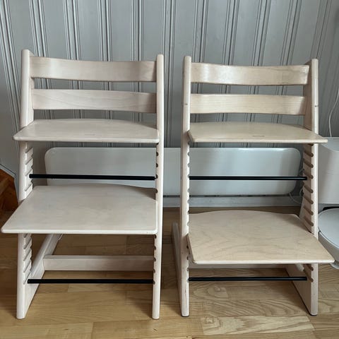 Selger en godt men sånnsett pent brukt hvit tripp trapp stol. Original hvit farge. Passer alt av nytt tilbehør som newbornsete og babysett/brett. Passer inn i de fleste hjem med sin lyse farge.