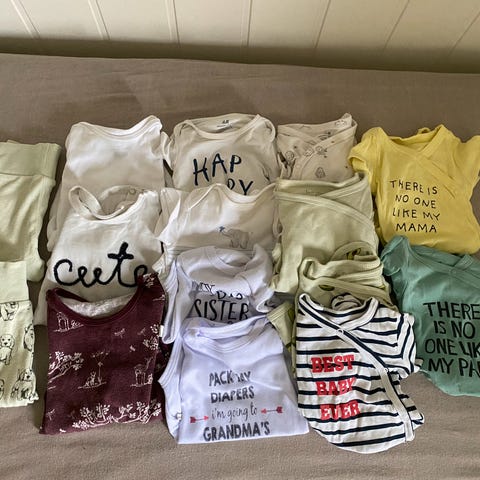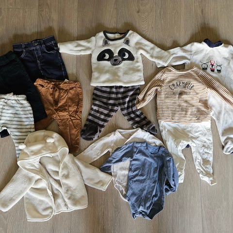 Merker: Lindex og HM. Bodyene fra Lindex er store i str, og er brukt sammen med klær i str. 74.