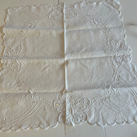 Nydelig arvet duk og brikker kjøpt i utland, tror ikke det er brukt. Selges samlet.
