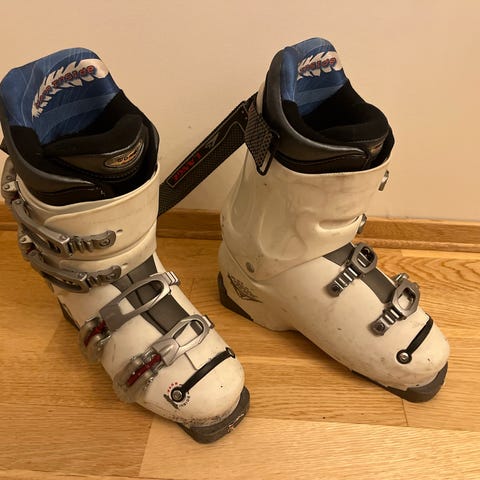 Lange skistøvler i størrelse 7.5 / 38.5 med svart farge og blå spenner. Skistøvlene har fire spenner for justering og en stropp øverst for ekstra støtte. Laget for alpinski.
