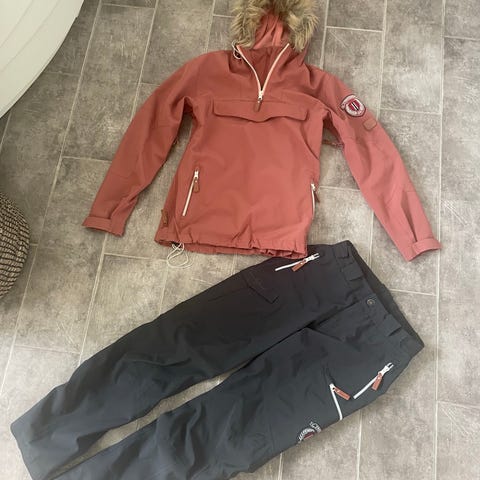 Pent brukt vind-regn anorakk + skallbukse fra Twentyfour. Hette på jakke, glidelås nederst på buksene, str 10år. Lyseblå jakke og grå utebukse. Trenger vask. Perfekt til vår og høst!