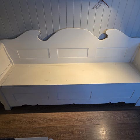 En gammel slagbenk tilhørt en gammel gård på Vestlandet. Kjøpt på Finn i fjor og må selges nå som jeg skal flytte til en mindre leilighet. Fint rom til oppbevaring. Malt i hvit, men kan helt sikkert slipes eller males.