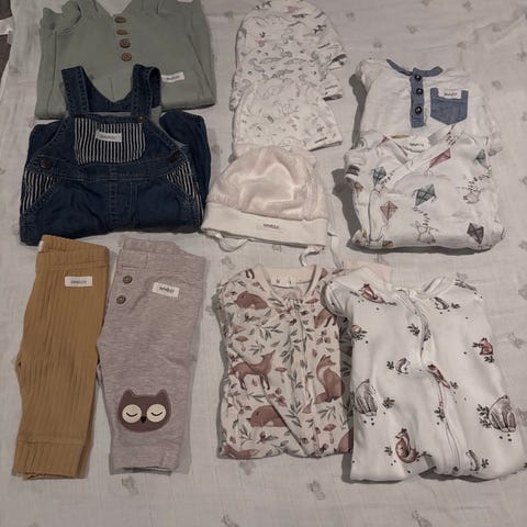 Selger en klespakke i str. 56 som inneholder 2 bodyer, 5 bukser og 2 par ubrukte klorevotter (kun vasket).