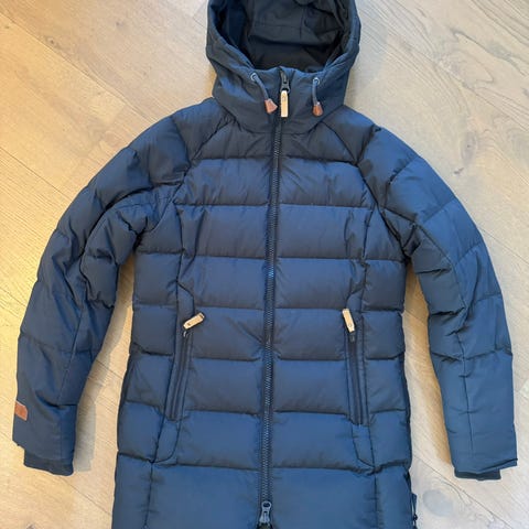 Twentyfour dunparkas i oransje farge for kvinner, størrelse S. Jakken er laget av dun, som gir isolasjon og varme. Er litt lengere på baksiden. Varm og behagelig.