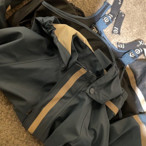 Pent brukt regnsett fra Wheat str 116 selges. Det mangler en knapp til den ene strikken under foten, ellers er det ingen skader. Romslig i størrelsen.