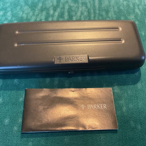 Parker Sonnet Fountain Pen med avtakbar hette. Pennen har en klassisk design med blå lakk og gullfargede detaljer. Egnet for daglig skriving og samling.