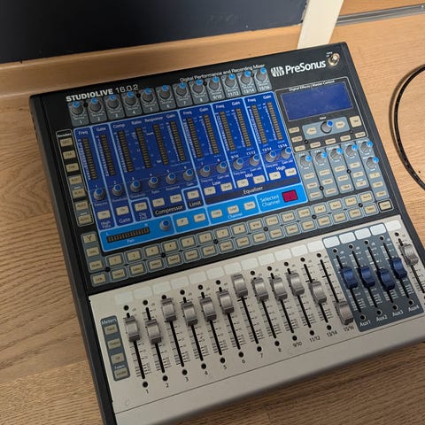 PreSonus FaderPort lydmikserkontroller med enkel fader, flere funksjonsknapper og tilkoblingskabel. Enheten er designet for å kontrollere lydmikserprogramvare og gir presisjonskontroll over lydnivåer og effekter.