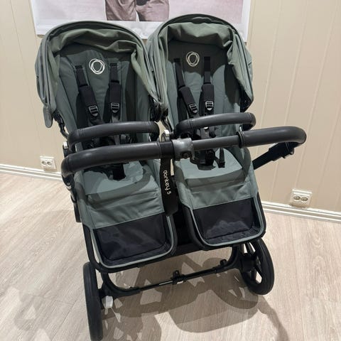 Bugaboo Donkey barnevogn med flere tilbehør. Inkluderer sete, kalesje, og diverse oppbevaringsløsninger. Farge og materiale ikke spesifisert.
