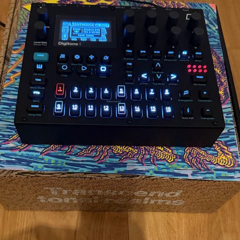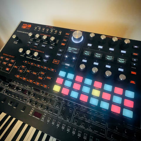ASM Hydrasynth Desktop synthesizer med svart farge. Har flere knapper, brytere og pads for kontroll, samt flere tilkoblingsporter på baksiden for lyd og MIDI. Enhet for musikkproduksjon og lydsyntese.