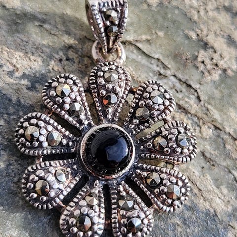 Stort tungt anheng formet som en sort blomst med blank krystaller/strass.