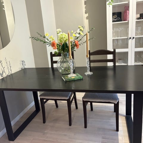 Selger 5 stk spisebordstoler, ukjent merke. Stolene er av god kvalitet og gode å sitte i. Stolene har naturlige bruksmerker og noen har noen hakk/bruksmerker.