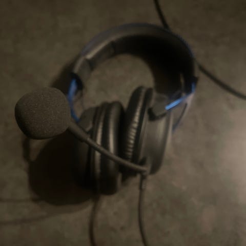HyperX Cloud Chat Headset med blå farge, designet for klar tale og komfort under bruk. Passer til PlayStation, PC og mobile enheter. Justerbar mikrofon og behagelige øreputer for langvarig bruk.