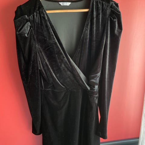 Elegant og feminin kjole i sort med diskret sølvglitter ✨ Perfekt til julebord, fest, selskap eller en kveld ute. Kjolen har flatterende V-utringning, lange ermer og elastisk markert liv som gir fin passform. Behagelig stretch og fôr som gjør den komfortabel å ha på.