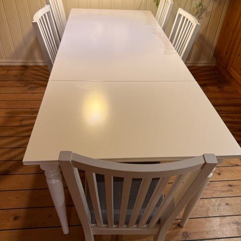 Spisebord med innleggsplate som oppbevares under bordplaten.