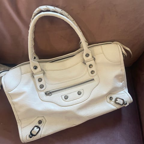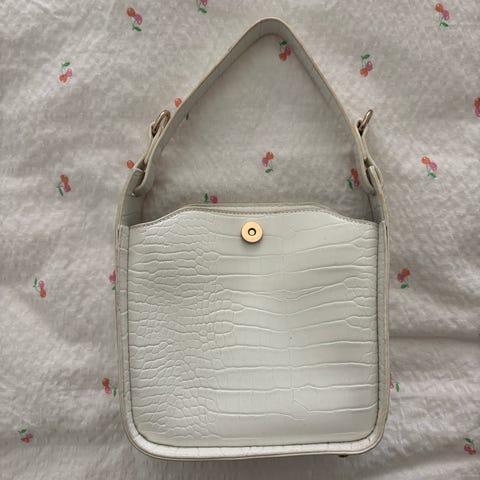Veske i kunstlær for dame i hvit farge. Vesken har to håndtak og en avtagbar skulderrem. Den har glidelåslukking og dekorative detaljer med nagler. Egnet for daglig bruk og oppbevaring av personlige eiendeler.