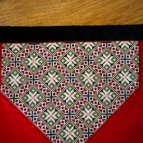 Håndvevde detaljer til hardangerbunad; Bringeduk, belte og fangband i flere fargekombinasjoner og mønster. Leverer også håndvevde vesteband. Prisen er for bringeduk og frakt kommer i tillegg. Belter, fangband, vesteband veves på bestilling.