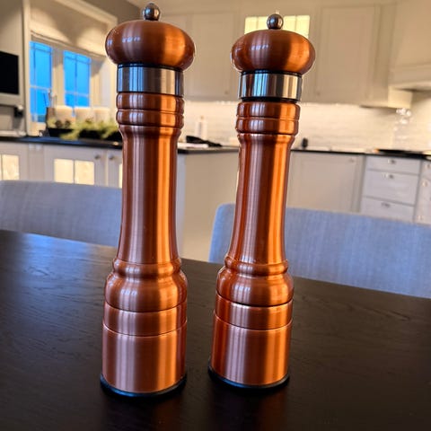 Salt og pepper kvern laget i plast med lokk i tre. Høyde ca. 20 cm. Designet for manuell kverning av salt krydder eller lignende ingredienser.