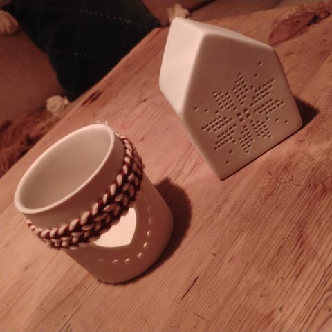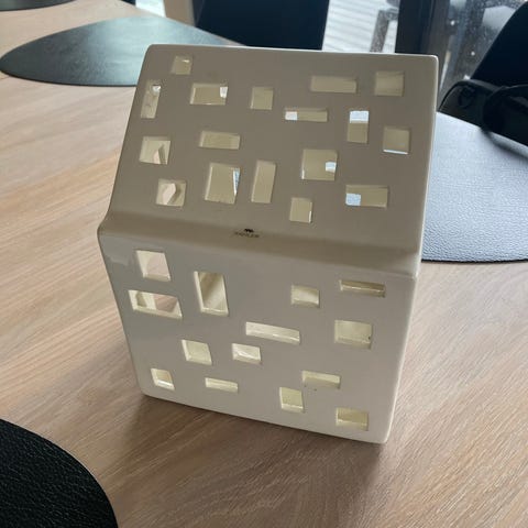 Kähler Bakkebøker Baekke keramikkhus med perforert design. Produktet er laget i hvit keramikk og har dekorative hull som gir et unikt lys- og skyggespill. Egnet som dekorasjon eller lyslykt.