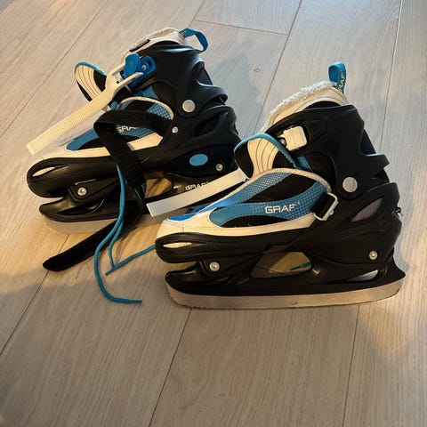 Graf Kid Adj. Ice Skate ishockey skøyter for barn i størrelse 27- 30. Skøytene er justerbare og har svart og hvit farge. En fin skøyte til nybegynnere.