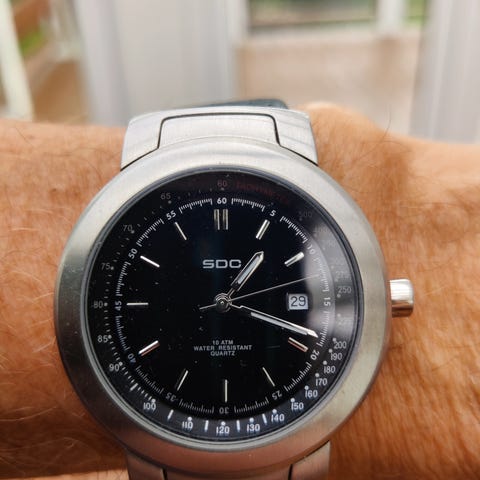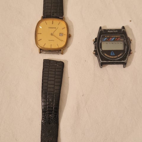 Denne to tonede med hvit urskive måler 40mm. Har datovisning ved klokken 6.