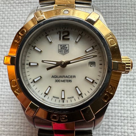 Nydelig TAG Heuer aquaracer med perlemorskive og 45 diamanter Top Wesselton/VVS. Diamantene utgjør ca 0,55 carat. Klokken er pent brukt og service/trykktest for kort tid siden. Tilsvarende modell nypris ca 60000kr