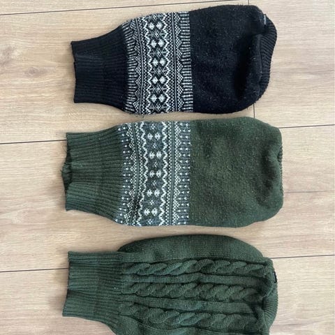 Begge er strikk i polyester, og varmer ikke så mye på veldig kalde dager med mange minusgrader.
