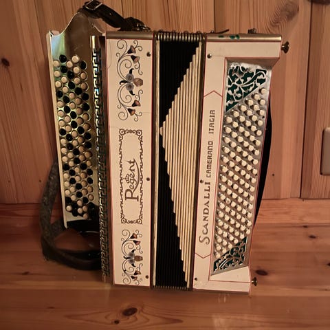Settimo Soprani ( Scandalli) usikker på årstall. Veldig djup og rom bass og lyd. 4 KORIG MUSETTE. Ganske lett. Selges pga helseplager. Det som må fikses er: noe ustemt, eller helst skinnlapper/ ventiler. To basser henger. På ytre rad, øverst. NB det er ikke skomgummi på labber, i bassen eller diskant. Belgen er tett, men to belghjørner kan fikses. Belg låsingen er innvendig, men en knapp på ene siden. Tenker at en kan fikse det. Setter 1500kr. Da taper jeg endel. Det er veldig gode stemmer i det. Får jeg ikke prisen, så kan jeg sende det på reperasjon. Se på registerknappene. De ligner på Scandalli sine. Men gi gjerne bud. Har helseutfordringer, ellers hadde jeg fått ordna trekkspillet. Sendes i posten med forsikring. Ca 3-400 i frakt.