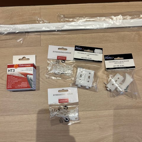 Selger Aksel gsrdinskinne, glidere, endedeksel og braketter. Gardinstangen er HVIT og er 250 cm lang.