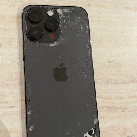 Apple iPhone XR mobiltelefon med 64 GB lagringskapasitet. Enheten har en svart farge og viser tegn på bruk med flere riper på skjerm og litt knust bakside.
