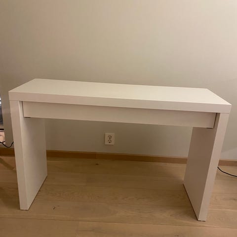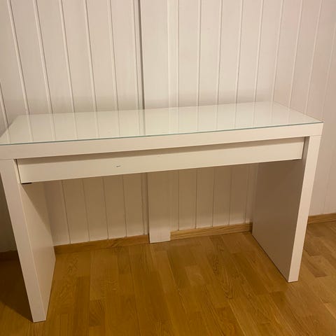 Pent bord med glass top og en hylle, veggfester medfølger fremstår som ny.