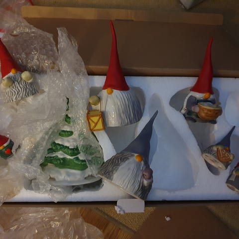 Juletrær i ulike størrelser til en julelandsby eller liknende. Høyde mellom 5 og 14 cm.