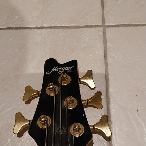 Morgan Legend Series El-bass med svart kropp, inkludert bæreveske, reim med dødningshoder og kabel. Bassgitaren fungerer som den skal, men har nok godt av en service. Kabel som medfølger er godt brukt, funker, men støyer noe. Anbefaler å kjøpe/bruke ny kabel til utenom øving hjemme.