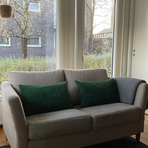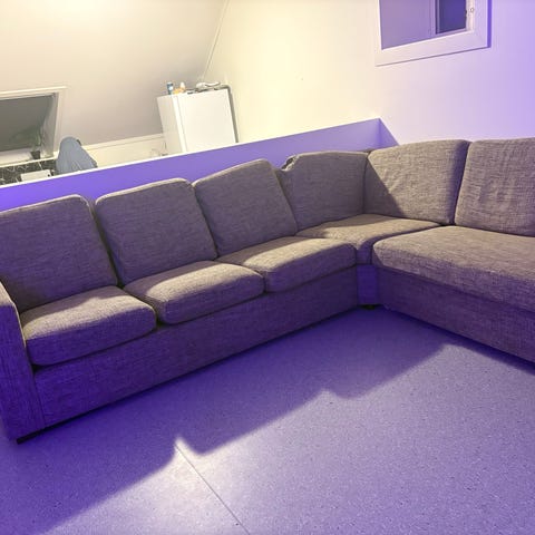 Pen sofa fra Furninova med sjeselong venstre. Veldig god å sitte i. Tilhørende puter følger med. Sittehøyde 40 cm, dybde sitteputer 72 cm. Se over for øvrige mål.