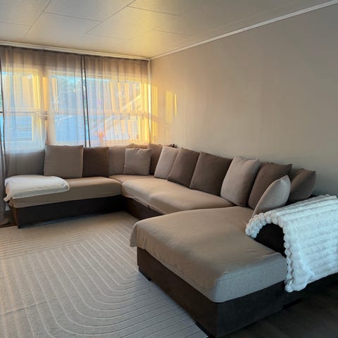 Hjørnesofa med sjeselong (hjørne på venstre side) selges pga flytting og at den ble for stor for ny bolig.
