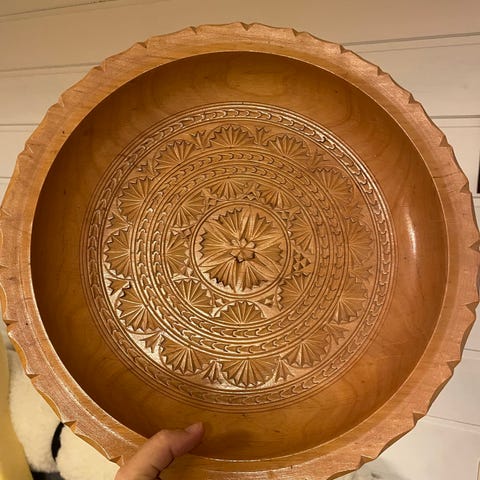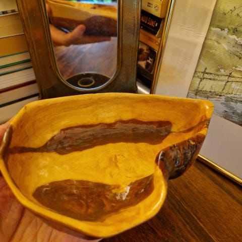 Håndlaget trebolle i naturlig tre med ujevn, organisk form. Skålen har en rustikk tekstur og er egnet som dekorativt element eller til oppbevaring. Høyde 14cm, lengde 48cm, bredde 39 cm, vekt ca. 4,4 kg.