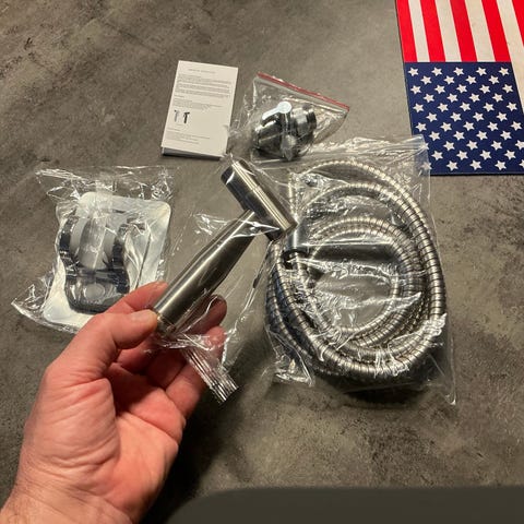 Dusjhodet har flere funksjoner og leveres med veggfeste slik at det kan monteres ved siden av vasken.