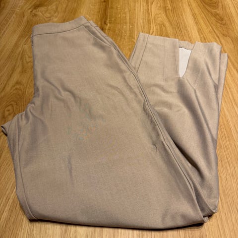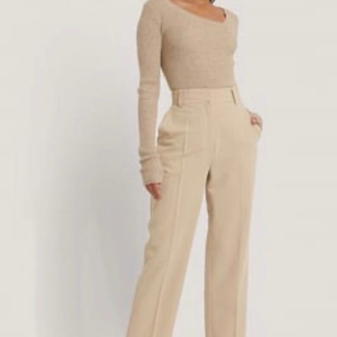 Dressbukse fra NA-KD. To første bilder er lånt. 78% polyester, 18% viskose og 4% elastan. Pent brukt. Merk er et svakt merke nederst på ene leggen, se siste bilde.