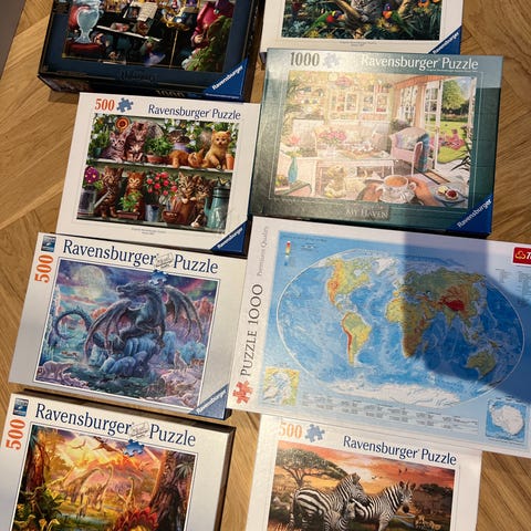 Ravensburger puslespill med 300 biter. Inneholder flere forskjellige motiver inkludert dyr, natur og karakterer. Som ny.
