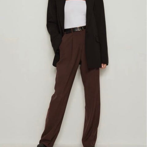 Dressbukse fra NA-KD. Første bildet er lånt. 78% polyester, 18% viskose og 4% elastan. Pent brukt. Merk er et lite merke helst nederst på baksiden av ene leggen, se siste bilde.