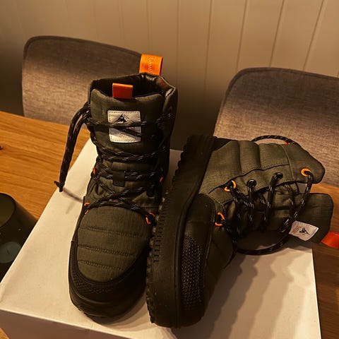 SWIMS Snow Runner Mid i størrelse 43. Varme vintersko. Skoene er svarte med oransje detaljer. Sålen har et mønster som gir godt grep på ulike underlag.