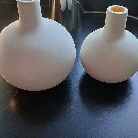 Høyde 31cm og 27cm. Begge er 11,5 cm fra tupp til tupp i bottn.