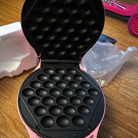 Boble vaffeljern i rosa farge. Elektrisk apparat med non-stick belegg for enkel rengjøring. Passer til å lage små, runde boblevafler.